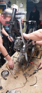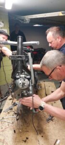 Mit vereinten Kräften und gut sortiertem Werkzeug ging’s zügig voran. Um 20:11 Uhr war der alte Rahmen bereits ausgebaut, der neue stand bereit auf der Bühne – ein Anblick, der Schrauberherzen höherschlagen lässt. Die Stimmung war fokussiert, aber wie immer begleitet von lockeren Sprüchen und helfenden Händen.